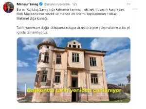 Sosyal Medya hesaplarından yaptığı paylaşımla, tarihi Hallaçlı Mehmet Ağa Konağı’nda restorasyon çalışmalarının yakında başlayacağını duyuran Başkan Yavaş, “Burası Kurtuluş Savaşı’nda kahramanlarımızın ekmek ihtiyacını karşılayan, Milli Mücadele’nin maddi ve manevi en önemli kapılarından; Hallaçlı Mehmet Ağa Konağı. Tarihi yapımızın doğal dokusunu koruyarak restorasyon çalışmalarımızı bu yıl içinde tamamlıyoruz” dedi.