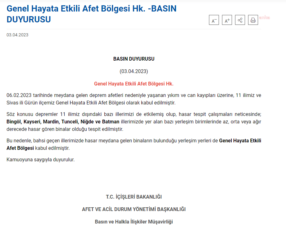 “06.02.2023 tarihinde meydana gelen deprem afetleri nedeniyle yaşanan yıkım ve can kayıpları üzerine, 11 ilimiz ve Sivas ili Gürün ilçemiz Genel Hayata Etkili Afet Bölgesi olarak kabul edilmiştir.