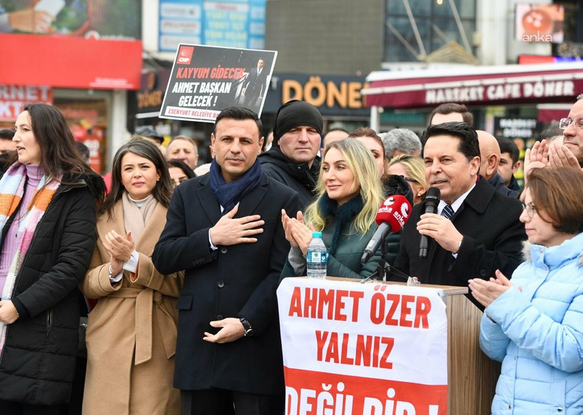 Sadece ben değil değerli kardeşlerim. Bakın basın mensuplarına bunun belgelerini dağıttım. Mahkeme müzekkere yazdı. Dedi ki Ahmet Özer’le ilgili bugüne kadar Türkiye Cumhuriyeti Devleti belgelerinde terörle ilgili terör üyeliği ilgili tek bir kanıt var mı varsa gönder. Gelen yazıyı tek bir kanıt yok Ahmet Özer tertemizdir. Mahkeme kendi kendini tekzip etti. Aynı zamanda mahkeme yazdı ki Ahmet Özer hakkında bugüne kadar itirafçı olmuş binlerce kişi var. Herhangi bir ifade var mı? Onun hakkında herhangi bir söz söyleyen var mı? Gelen cevapta yoktur. Dolayısıyla mahkeme bu verdiği cezayla kendi kendini tekzip etti. Belki bu ceza neyin cezası değerli kardeşlerim? Bu ceza Esenyurt rantlarına kayyum yoluyla devam telaşıdır. Ama devam ettirmeyeceğiz değerli kardeşlerim. Öyle kolay değil öyle halk iradesi gaspı kolay değil. Sizin iradenizin gaspına asla izin vermeyiz. Neden biliyor musunuz? Bir, benim açtığım bir dava var Anayasa Mahkemesi’nde. Dokuzuncu idare mahkemesi kayyum anayasaya aykırıdır diye bizim talebimizi kabul etti ve şu anda orada onların önünde. Eğer o dava lehimize sonuçlanırsa kayyum olayı sadece Esenyurt’ta değil bütün Türkiye’de iftar olacak ve kayyum buradan çekip gidecek. Sizin iradeniz iş başına gelecek.
