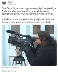 Medya ve Hukuk Çalışmaları Derneği’nin aktardığına göre, Sibel Tekin Cuma günü, yaz saati uygulamasıyla ilgili bir belgesel için Ankara Tuzluçayır’da çekim yaparken aracı görüntülenen polislerin şikâyeti sonucu gözaltına alındı. Belgeselci Tekin’in evinde sabaha karşı arama yaparak evdeki dijital malzemelere, görüntü arşivlerine el koyan polise ek gözaltı süresi verildi. Tekin’in, savcılık sorgusunun ardından akşam saatlerinde sevk edildiği mahkeme tarafından ‘örgüt üyeliği” gerekçesiyle tutuklandığı açıklandı.
