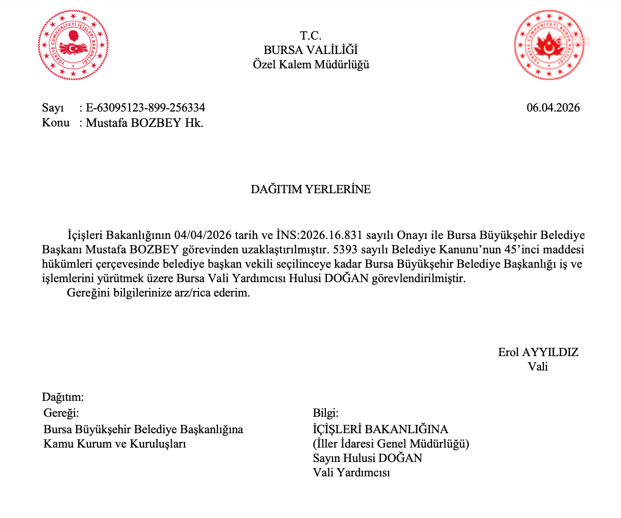 Bursa Valisi Erol Ayyıldız imzasıyla kurumlara gönderilen yazıda, 5393 Sayılı Belediye Kanunu’nun 45’inci maddesi uyarınca, belediye başkan vekili seçilinceye kadar belediye hizmetlerinin yürütülmesi için Bursa Vali Yardımcısı Hulusi Doğan’ın görevlendirildiği belirtildi.