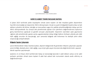 TMMOB Çevre Mühendisleri Odası İstanbul Şubesi; 6 Şubat tarihinde meydana gelen Kahramanmaraş merkezli depremlerin ardından, Hatay Asbest Teknik İnceleme Raporu’nu yayınladı. Raporda; “Toplamda 4 lokasyondan 8 adet katı asbest numunesi alınmıştır. Alınan 8 numunenin 4 adedinde asbest tespit edilmiştir. Numune alınan bütün bölgelerden en az bir adet asbestli malzeme bulunmuştur” tespitine yer verildi. Raporda ayrıca; “Konutların, çadırların ve kamu kurumların yaklaşık 100 metre yakınında döküm sahaları tespit edilmiştir. Dere yatakları, orman arazileri, zeytinlikler, seralar, tarım arazileri ve su kaynaklarına çok yakın bölgeler döküm sahası olarak tercih edilmiştir. Bu durum bir yeni bir afetin göstergesidir” denildi.