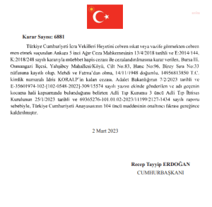 Cumhurbaşkanı Recep Tayyip Erdoğan, 28 Şubat Davası hükümlüsü emekli Orgeneral Ahmet Çörekçi, emekli Korgeneral Hakkı Kılınç ve emekli Tuğgeneral İdris Koralp’in kalan cezalarını sağlık sorunları nedeniyle affetti.