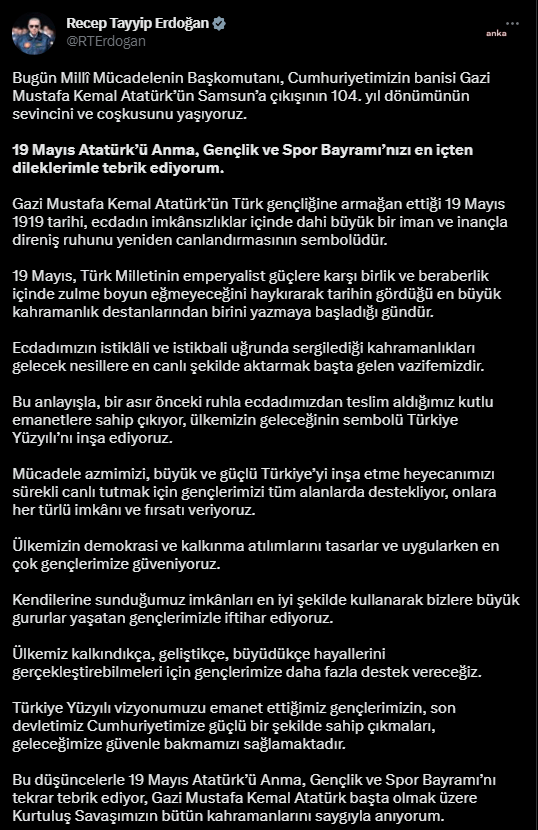 Cumhurbaşkanı Erdoğan, 19 Mayıs Atatürk’ü Anma, Gençlik ve Spor Bayramı dolayısıyla bugün sosyal medya hesabından bir mesaj yayınladı. Erdoğan’ın mesajı şöyle: