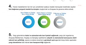 -Yargı görevlerine kabul ve atamalarında tam liyakati sağlamak; yargı üst organlarına, Anayasa Mahkemesi, Yargıtay ve Danıştay üyeliklerine adaylık ve atamalarda kamuoyunu dahil ederek tam şeffaflığı, seçme ve atama kararlarını gerekçeli açık oya tabi tutup bütün aşamaları yargı denetimine tabi kılarak tam hesap verirliği sağlamak.