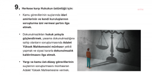 -Herkese karşı Hukukun üstünlüğü için: Kamu görevlilerinin suçlarında idari amirlerinin ve kendi kuruluşlarının soruşturma izni vermesi şartını ilga etmek. Dokunulmazlıkları hukuk yoluyla güçlendirmek, yasama dokunulmazlığına sahip olanların soruşturmasında Adalet Yüksek Mahkemesini münhasır yetkili yapmak ve siyasi kararla dokunulmazlık kaldırılmasını ilga etmek. Yargı ve kamu üst-düzey görevlilerinin suçlarının soruşturmasını münhasıran Adalet Yüksek Mahkemesine vermek.