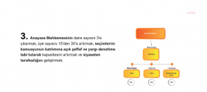 -Anayasa Mahkemesi’nin daire sayısını 3’e çıkarmak, üye sayısını 15’den 30’a artırmak, seçimlerini kamuoyunun katılımına açık şeffaf ve yargı denetime tabi tutarak kapasitesini artırmak ve siyaseten tarafsızlığını geliştirmek.
