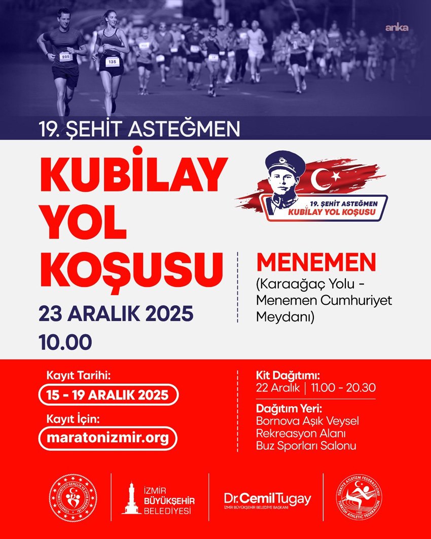 Menemen’de 1930 yılında Cumhuriyet karşıtları tarafından katledilen devrim şehitleri Asteğmen Mustafa Fehmi Kubilay, Bekçi Hasan ve Bekçi Şevki 23 Aralık’ta bir kez daha anılacak. Anma töreni etkinlikleri kapsamında İzmir Büyükşehir Belediyesi tarafından 19’uncu kez yol koşusu da düzenlenecek. 10 kilometrelik yol koşusu, saat 10.00’da Menemen Karaağaç Yolu üzerinden başlayacak ve Menemen Cumhuriyet Meydanı’nda noktalanacak. 19’uncu Şehit Asteğmen Kubilay Koşusu için 20 Aralık saat 16.00’ya kadar https://www.maratonizmir.org/ üzerinden kayıt yapılabilecek. Yarış, genç erkek ve genç kadınlarda 2006-2007 doğumlular, büyük erkek ve büyük kadınlarda 2005 ve üzeri doğumlular kategorilerinde düzenlenecek. Kategorilerinde ilk üçe girenlere kupa, ilk ona giren sporculara ise para ödülü verilecek.