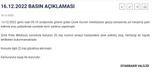 Diyarbakır Valiliği’nden yapılan ilk yazılı açıklamada, “16.12.2022 günü saat 05:10 sıralarında göreve giden çevik kuvvet minibüsüne, geçişi esnasında yol kenarına park edilmiş araç patlatılmak suretiyle terör saldırısı yapılmıştır. Zırhlı polis minibüsü içerisinde bulunan 9 kişi kontrol amaçlı hastanelere sevk edilmiş olup, herhangi bir hayati tehlikeleri bulunmamaktadır. Konuyla ilgili 2 kişi gözaltına alınmıştır” denildi.