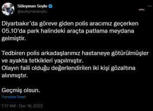 İçişleri Bakanı Süleyman Soylu da sosyal medya hesabından, “Diyarbakır’da göreve giden polis aracımız geçerken 05:10’da park halindeki araçta patlama meydana gelmiştir. Tedbiren polis arkadaşlarımız hastaneye götürülmüşler ve ayakta tetkikleri yapılmıştır. Olayın faili olduğu değerlendirilen iki kişi gözaltına alınmıştır. Geçmiş olsun” açıklamasını yaptı.