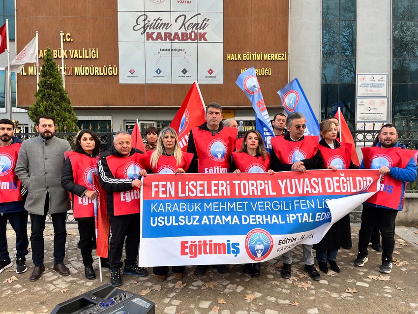 Eğitim-İş Karabük Şube Başkanı Zeki Çelik, fen liselerinde öğretmen atamalarının özel koşullara bağlı olduğunu hatırlatarak, “Fen liseleri, alan yeterliliği ve objektif ölçütleri zorunlu kılan seçkin eğitim kurumlarıdır. Mehmet Vergili Fen Lisesi, Karabük’ün gururu bir okuldur. Ancak yapılan bu atama, usul ve esaslar hiçe sayılarak tepeden inme bir biçimde gerçekleştirilmiştir. Bu bir skandaldır, büyük bir haksızlıktır” dedi.