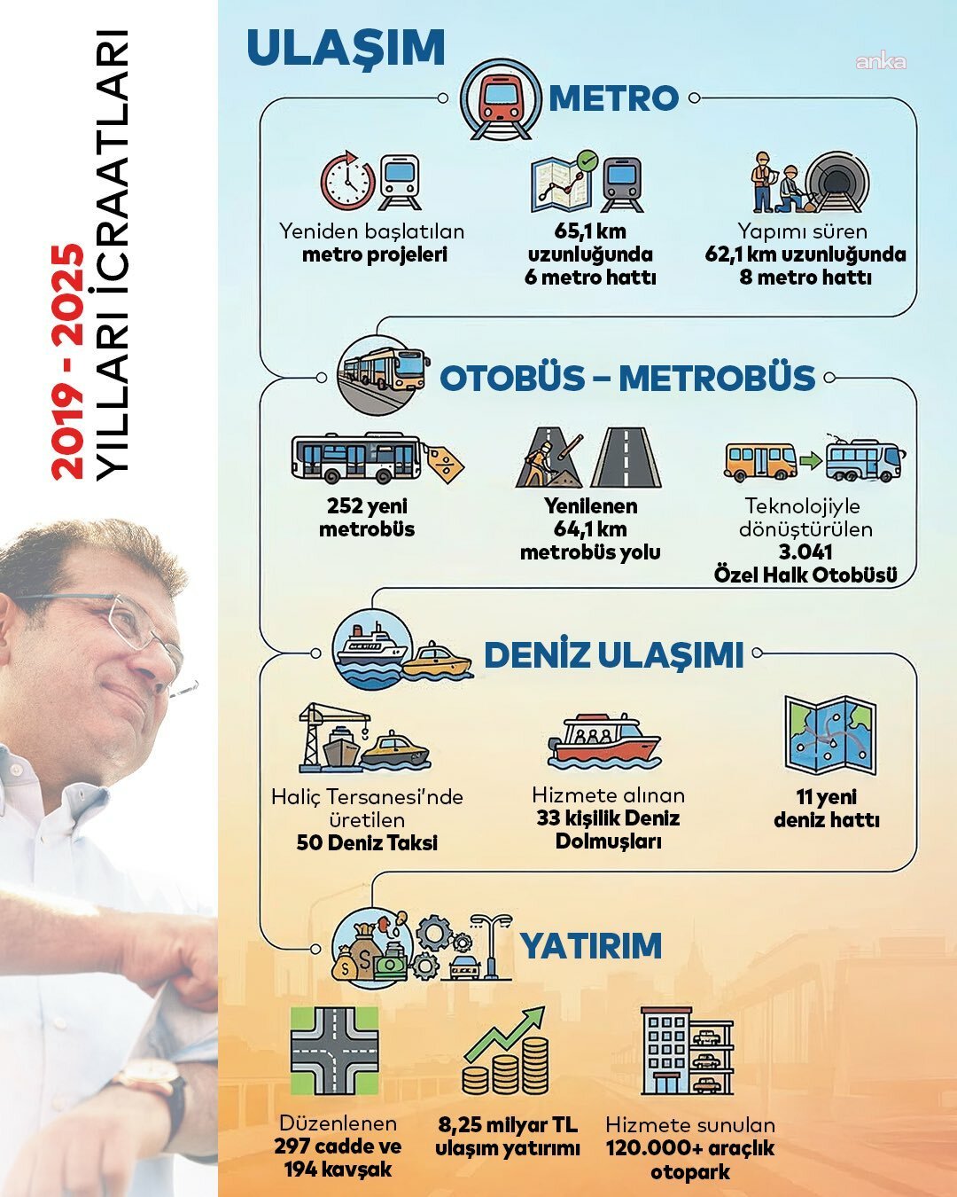 (İSTANBUL) – Silivri Cezaevi’nde tutuklu İstanbul Büyükşehir Belediye Başkanı Ekrem İmamoğlu, göreve geldiği 2019 yılından bu yana yaptıkları hizmetleri paylaşarak, “Daha niceleri Türkiye için olacak” ifadesini kullandı.