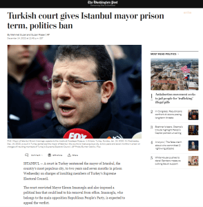 WASHINGTON POST: Mahkeme Belediye Başkanı Ekrem İmamoğlu’nu mahkûm etti ve görevden alınmasına yol açabilecek bir siyasi yasak getirdi. Ana muhalefet partilerinden olan CHP’li İmamoğlu’nun hakkındaki kararı temyiz etmesi bekleniyor.