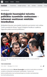 YLE: Erdoğan’ın rakibi olması beklenen siyasetçi hapis cezasına çarptırıldı. İstanbul’da binlerce kişi protesto etti. Kamuoyu anketlerine göre, İBB Başkanı, haziran seçimlerinde Türkiye Cumhurbaşkanı Recep Tayyip Erdoğan’ı yenebilir. Muhalefet, kararı siyasi olarak değerlendiriyor.
