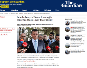 THE GUARDIAN: Türkiye’de bir mahkeme, İBB Başkanı hakkında 2 yıldan fazla hapis cezası ve İmamoğlu’nu destekleyenlerin, Cumhurbaşkanı Recep Tayyip Erdoğan’ın önemli bir rakibini dışlamak için siyasi bir çaba olarak nitelendirdiği bir hamleyle siyasi yasak kararı aldı.