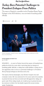 THE NEW YORK TIMES: Türkiye, Cumhurbaşkanı Recep Tayyip Erdoğan’ın muhtemel rakibini siyasetten menetti.