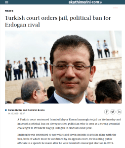 EKATHIMERINI: Türkiye’de bir mahkeme çarşamba günü İBB Başkanı Ekrem İmamoğlu’nu hapis cezasına çarptırdı ve önümüzdeki sene yapılacak seçimlerde Cumhurbaşkanı Tayyip Erdoğan’a karşı güçlü bir rakip olarak görülen muhalif siyasetçiye siyasi yasak getirdi.