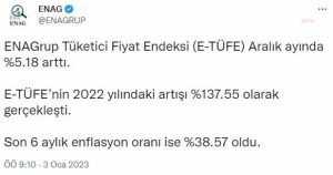 ENAGrup, aralık ayına ilişkin enflasyon hesaplamasını açıkladı. ENAGrup’un Tüketici Fiyat Endeksi (E-TÜFE) aralık ayında bir önceki aya göre yüzde 5,18 oranında arttı. Bu artışa rağmen, yıllık enflasyon baz etkisiyle yüzde 170,70’ten yüzde 137,55’e geriledi.