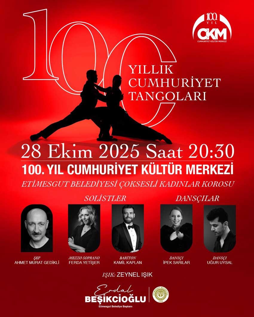 ANKARA – Ulu Önderimiz Gazi Mustafa Kemal Atatürk’ün önderliğinde ilan edilen Türkiye Cumhuriyeti, bu yıl 102. yaşını kutluyor. Etimesgut Belediyesi, bu anlamlı günü unutulmaz kılacak etkinlik ve açılışlarla dolu özel bir programla kutlamaya hazırlanıyor. 28 Ekim 2025 Salı günü saat 20.30’da 100. Yıl Cumhuriyet Kültür Merkezi’nde sahnelenecek “100 Yıllık Cumhuriyet Tangoları” konserinde, Etimesgut Belediyesi Çok Sesli Kadınlar Korosu izleyicilere unutulmaz bir gece yaşatacak. Şef Ahmet Murat Gedikli yönetimindeki programda, mezzo soprano Ferda Yetişer ve bariton Kamil Kaplan sahne alırken, danslarıyla İpek Sarılar ve Uğur Uysal geceye renk katacak. Işık tasarımı Zeynel Işık tarafından gerçekleştirilecek etkinlik, Cumhuriyet’in 100 yıllık coşkusunu müzik ve dansla taçlandıracak.