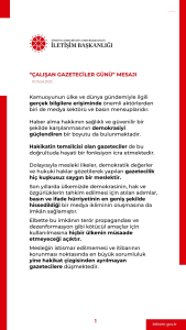 Biz de Cumhurbaşkanlığı İletişim Başkanlığı olarak basın mensuplarının çalışma şartlarının iyileştirilmesi ve sektörel yeniliklerin desteklenmesi gibi birçok adımla etkin bir medya ortamının oluşmasına katkı vermeyi sürdüreceğiz. Ülkemizin ve dünyanın dört bir yanında doğrulukla, saygınlıkla ve hakikatle görev ifa eden kıymetli basın mensuplarımızın Çalışan Gazeteciler Günü’nü en içten dileklerimle kutluyorum. Mesleğin güvenini, itibarını ve niteliğini artıran gazetecilere şükranlarımı sunuyor, tüm basın mensuplarımıza çalışmalarında başarılar diliyorum.”