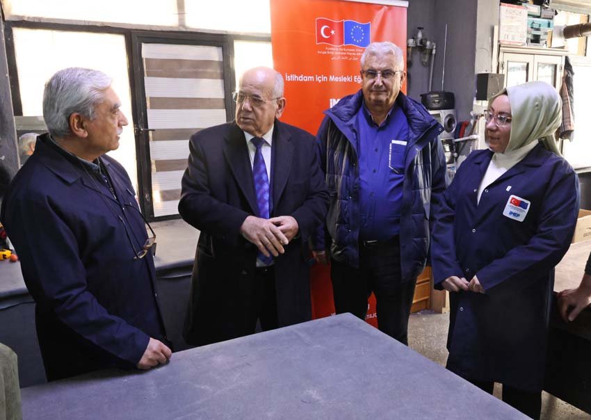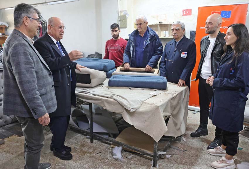 ANKESOB Başkanı Hüseyin Ar, Ankara Döşemeciler Esnaf ve Sanatkarlar Odası Başkanı Şadi Başar ve İstihdam İçin Mesleki Eğitim Programı (İMEP 2) Ankara Proje Koordinatörü Aydın Türkoğlu ile birlikte Siteler’de gerçekleştirdiği ziyaretler sırasında, İMEP 2 kapsamında geçici ve uluslararası koruma altındaki yabancılar ile Türk vatandaşı kursiyerlerin eğitim aldığı ve ardından işbaşı yaptığı Döşemeciler Odasına üye atölyelerde, sanatkar kadın girişimciler; Sultan Umut (Talmi Döşeme) ve Gamze Koç (Resto Mobilya Döşeme) ile bir araya geldi.