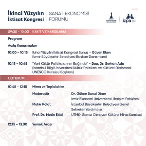 “Sanat Ekonomisi Forumu”, kültür mirası alanında çalışan akademisyenler, yönetmen ve yapımcılar, arkeologlar, müzecilik uzmanları, küratörler ve sanatçıları İzmir’de buluşturacak. Katılımcılar, bugünün toplumsal ve kültürel ikliminin yarattığı olumsuzlukları ve bu sorunların nasıl çözülebileceğiyle ilgili de politikalar üretme görevini üstlenecek.