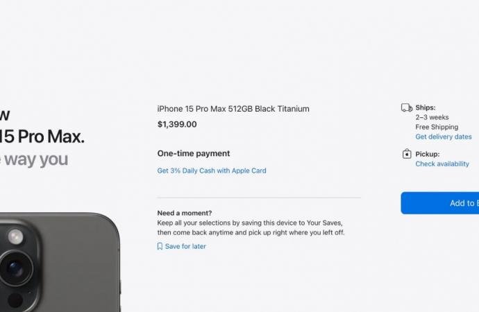 Şu andan itibaren 5-7 gün içinde mevcut olan tek seçenek, en azından ABD Apple Store sitesinde 512 GB’lık Mavi Titanyum iPhone 15 Pro Max. İlginç bir şekilde, 22 Eylül için hala tüm renklerde ve depolama kapasitelerinde bir iPhone 15 Pro alabilirsiniz.