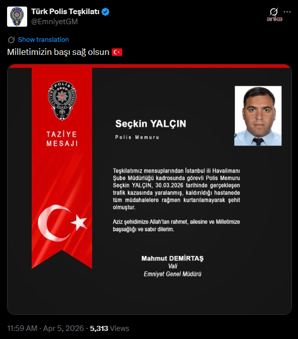 “Teşkilatımız mensuplarından İstanbul İli Havalimanı Şube Müdürlüğü kadrosunda görevli Polis Memuru Seçkin Yalçın, 30.03.2026 tarihinde gerçekleşen trafik kazasında yaralanmış, kaldırıldığı hastanede tüm müdahalelere rağmen kurtarılamayarak şehit olmuştur. Aziz şehidimize Allah’tan rahmet, ailesine ve Milletimize başsağlığı ve sabır dilerim.”