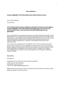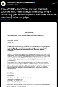 İsveç Adalet Bakanlığı, 1 Ocak 2023 tarihinde yürürlüğe giren terörle mücadele kapsamındaki anayasa değişikliğine ilişkin bir açıklama yaptı. İsveç Büyükelçiliği’nin de paylaştığı 30 Aralık 2022’de yapılan açıklama şöyle: