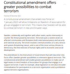 İsveç Adalet Bakanlığı, İsveç Anayasası’nda 1 Ocak 2023 tarihinde yürürlüğe giren değişikliğe ilişkin “İsveç’e terörle mücadele alanında daha güçlü imkânlar sunmaktadır. Anayasa değişikliği, terör faaliyeti yürüten veya terörü destekleyen grupların örgütlenme hürriyetinin kanun çerçevesinde kısıtlanması konusunda imkânların artması anlamına gelmektedir. Bu değişiklik, kanun koyucular açısından, örneğin bir terör örgütüne katılımı daha geniş bir çerçeveyle suç unsuru hâline getirmeyi ve terör örgütlerini yasaklamayı olanaklı kılmaktadır” açıklamasını yaptı.