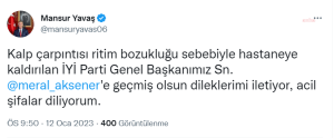 Ankara Büyükşehir Belediye (ABB) Başkanı Mansur Yavaş, Akşener’e geçmiş olsun dileklerini iletti. Yavaş, “Kalp çarpıntısı ritim bozukluğu sebebiyle hastaneye kaldırılan İYİ Parti Genel Başkanımız Sn. Meral Akşener’e geçmiş olsun dileklerimi iletiyor, acil şifalar diliyorum” mesajı yayınladı.