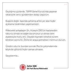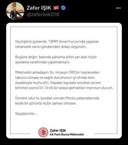 TBMM Genel Kurulu’nda İYİ Parti Trabzon Milletvekili Hüseyin Örs’e yumruk atarak yoğun bakıma kaldırılmasına neden olan AKP Bursa Milletvekili Zafer Işık, sosyal medya hesabından yazılı açıklama yaptı. Işık, açıklamasında şunları belirtti: