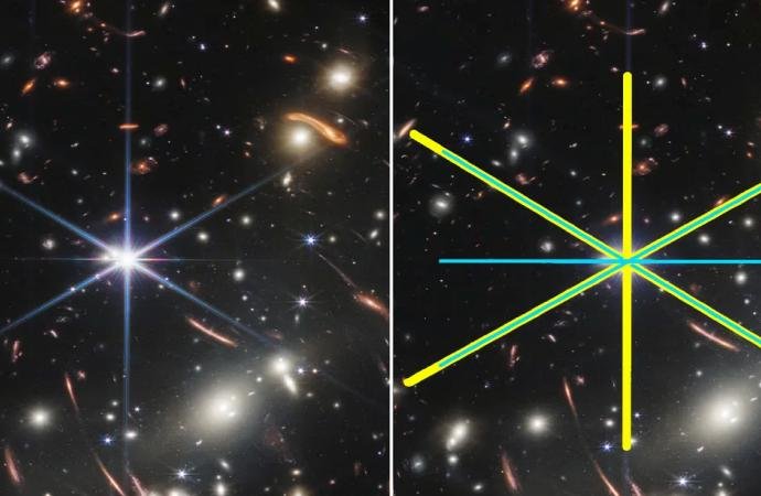 Bunun sebebi, JWST’nin kendine özgü başka bir özelliği daha olmasıdır. Birincil aynası bölümlere ayrılmıştır ve aynı zamanda kırınım özellikleri de onu oluşturan 18 altıgen parçadan yapılmıştır. Hatta görülen sivri çıkıntılara en çok katkıda bulunan şey aynaların şeklidir. Aynaların kenarları en belirgin sivri çıkıntıları oluşturduğu için, düzgün altıgen olan bu aynaların yarattığı çıkıntılar eşit aralıklıdır.