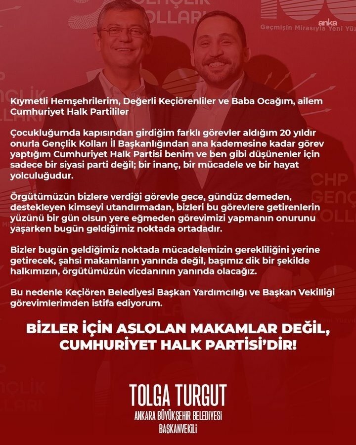 Bizler bugün geldiğimiz noktada mücadelemizin gerekliliğini yerine getirecek, şahsi makamların yanında değil, başımız dik bir şekilde halkımızın, örgütümüzün, vicdanının yanında olacağız. Bu nedenle Keçiören Belediyesi Başkan Yardımcılığı ve Başkan Vekilliği görevimlerimden istifa ediyorum. Bizler için aslolan makamlar değil; Cumhuriyet Halk Partisidir.”