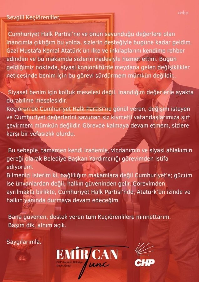 Siyaset benim için koltuk meselesi değil, inandığım değerlerle ayakta durabilme meselesidir. Keçiören’de Cumhuriyet Halk Partisi’ne gönül veren, değişim isteyen ve Cumhuriyet değerlerini savunan siz kıymetli vatandaşlarımıza sırt çevirmem mümkün değildir. Görevde kalmaya devam etmem, sizlere karşı bir vefasızlık olurdu.Bu sebeple, tamamen kendi irademle, vicdanımın ve siyasi ahlakımın gereği olarak Belediye Başkan Yardımcılığı görevimden istifa ediyorum.