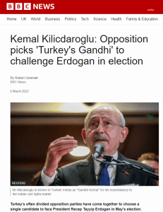 BBC: “Kemal Kılıçdaroğlu: Muhalefet, seçimlerde Erdoğan’a meydan okumak için ‘Türkiye’nin Gandi’sini seçiyor. Türkiye’nin sıklıkla bölünen muhalefet partileri, Mayıs ayındaki seçimlerde Cumhurbaşkanı Recep Tayyip Erdoğan’ın karşısına tek bir aday çıkarmak üzere bir araya geldi.”