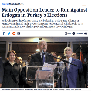 HAARETZ: “Ana muhalefet lideri Türkiye’deki seçimlerde Erdoğan’a karşı yarışacak. Aylar süren belirsizlik ve çekişmelerin ardından pazartesi günü altı partiden oluşan bir ittifak, Cumhurbaşkanı Recep Tayyip Erdoğan’a karşı ana muhalefet partisi lideri Kemal Kılıçdaroğlu’nu ortak aday olarak gösterdi.”