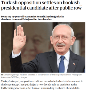 THE GUARDIAN: “Türk muhalefeti, kamuoyundaki tartışmaların ardından ‘kitapsever’ cumhurbaşkanı adayı üzerinde uzlaştı. Bazıları 74 yaşındaki ekonomist Kemal Kılıçdaroğlu’nun yirmi yıl sonra Erdoğan’ı yerinden edecek karizmaya sahip olmadığını belirtiyor. Türkiye’nin altı partili muhalefet ittifakı, aday seçiminde yaşanan anlaşmazlığın ardından, önümüzdeki seçimlerde Recep Tayyip Erdoğan’ın yirmi yıllık iktidarına meydan okumak üzere ‘kitap kurdu’ bir bürokratı seçti.”