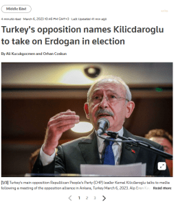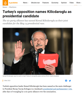 ALJAZEERA: “Türkiye muhalefeti Kemal Kılıçdaroğlu’nu cumhurbaşkanı adayı olarak gösterdi. Türkiye’de muhalefet lideri Kemal Kılıçdaroğlu, altı partiden oluşan ittifakın aday belirleme konusunda günlerdir süren tartışmanın ardından, önemli bir dönüm noktası olan cumhurbaşkanlığı ve meclis seçimlerinde Cumhurbaşkanı Recep Tayyip Erdoğan’ın başlıca rakibi olarak seçildi.”