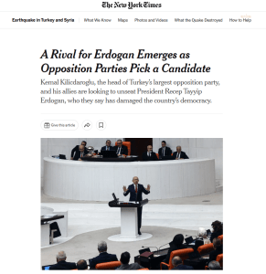 THE NEW YORK TIMES: “Erdoğan’ın rakibi belli oldu. Türkiye’nin ana muhalefet partisinin lideri Kemal Kılıçdaroğlu ve müttefikleri, ülkenin demokrasisine zarar verdiğini söyledikleri Cumhurbaşkanı Recep Tayyip Erdoğan’ı görevden almak istiyor.”