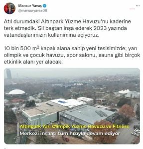Ankara Büyükşehir Belediyesi (ABB) Başkanı Mansur Yavaş, 2011 yılında yaşanan yoğun kar yağışı nedeniyle çatısı çöken Altınpark Yüzme Havuzu’nu yeniden inşa ettiklerini duyurdu. Yavaş, “Âtıl durumdaki Altınpark Yüzme Havuzu’nu kaderine terk etmedik. Sil baştan inşa ederek 2023 yazında vatandaşlarımızın kullanımına açıyoruz” dedi.