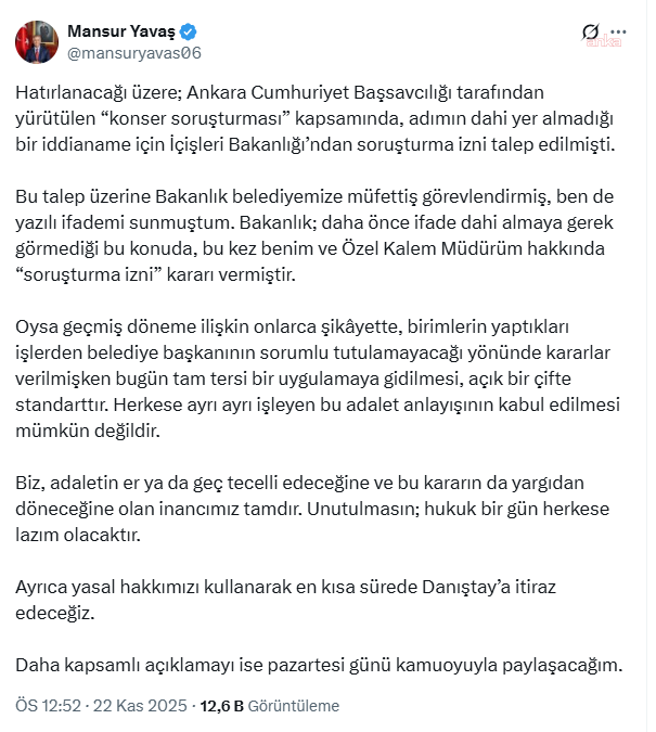 ABB Başkanı Mansur Yavaş, İçişleri Bakanlığı’nın konser harcamaları nedeniyle soruşturma izni vermesine ilişkin sosyal medya hesabından açıklama yaptı. Yavaş, şu ifadelere yer verdi: