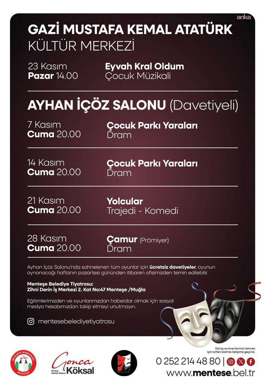 (MUĞLA) – Menteşe Belediye Tiyatrosu, Kasım ayı boyunca farklı türlerdeki oyunlarla sanatseverlerle buluşacak. Gazi Mustafa Kemal Atatürk Kültür Merkezi ve Ayhan İçöz Salonu’nda sahnelenecek oyunlar, dramdan çocuk müzikaline, trajediden komediye kadar geniş bir repertuvar sunacak.