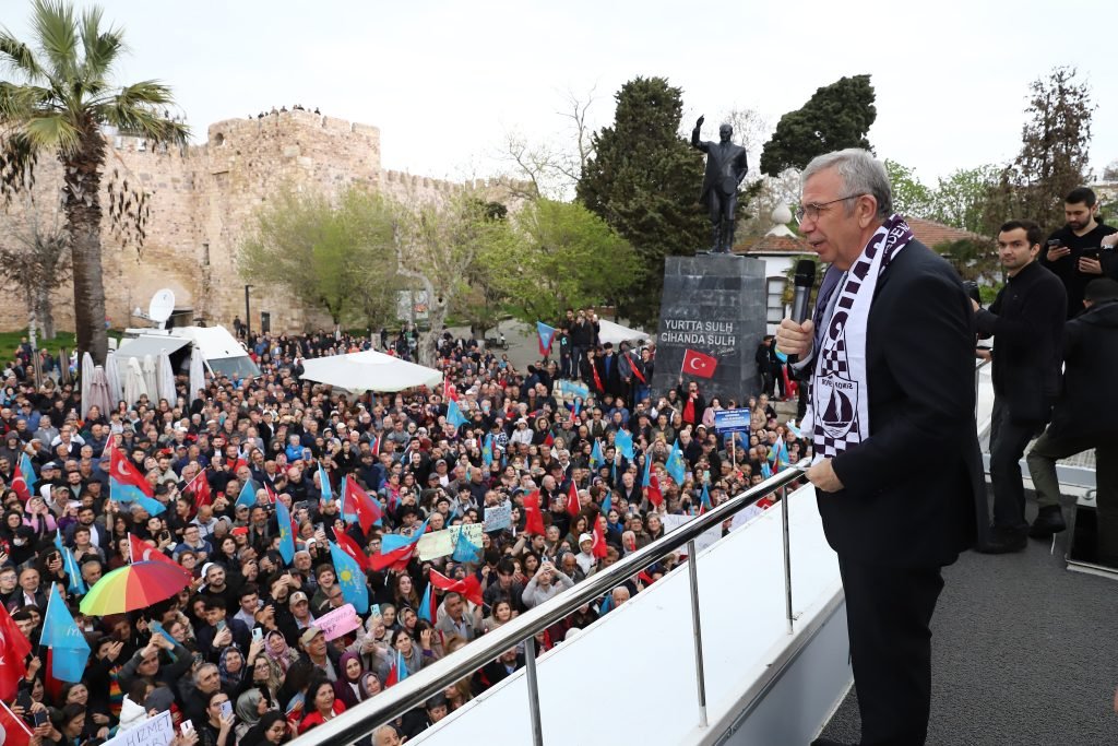 “İki belediye başkanıyla beraber; hem bizler hem Sayın Kılıçdaroğlu, haram yemeden, sosyal devlet nedir ortaya koyarak, kayırmadan, adaleti sağlayarak, demokrasiyi sağlayarak ve hukukun üstünlüğünü sağlayarak, şu gençlerin gelecek hayallerini yeniden inşa ederek; önce seçimi kazanacağız sonra da bu ucube sistemden el birliğiyle kurtulacağız. Size söz olsun. 50 bin tane dedikodu yapıyorlar, 50 bin tane iftira atıyorlar. Artık işleri iftiraya kaldı. Ama söyleyemedikleri bir şey var. Hırsız diyemiyorlar. Çünkü, kendileri hırsız. Hırsız deseler, hırsızlıklarını çat diye yüzlerine vuracağız. Beş maaşlı, 10 maaşlı, 15 maaşlı danışman olmayacak. 801 milyon dolara Ankara’da bir park yaptılar. Kaç çocuğun bursu ödenirdi? Kaç öğrencimize karşılıksız burs verilebilirdi? 801 milyon dolar… Yani 16 milyar lira. Utanmaları yok. Üç AK Partili müteahhite verildi. Sizin çocuklarınız ağladı, sizin çocuklarınız, umutsuz, mutsuz. İşte o nedenle bu harami düzeni beraber değiştireceğiz.