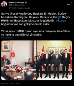 “Suriye Ulusal Koalisyonu Başkanı El-Maslat, Suriye Müzakere Komisyonu Başkanı Camus ve Suriye Geçici Hükümeti Başbakanı Mustafa ile görüştük. Suriye bağlamındaki son gelişmeleri ele aldık. 2254 sayılı BMGK Kararı uyarınca Suriye muhalefetine ve halkına desteğimizi yineledik.”