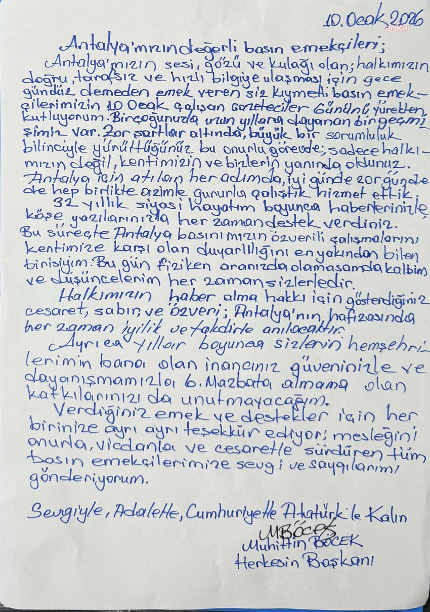 (ANKARA)- Tutuklu Antalya Büyükşehir Belediye Başkanı Muhittin Böcek, 10 Ocak Çalışan Gazeteciler Günü’ne ilişkin, “Antalya’mızın değerli basın emekçileri, Antalya’mızın sesi, gözü ve kulağı olan; halkımızın doğru, tarafsız ve hızlı bilgiye ulaşması için gece gündüz demeden emek veren siz kıymetli basın emekçilerimizin 10 Ocak Çalışan Gazeteciler Günü’nü yürekten kutluyorum” dedi.