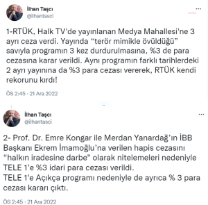 “Prof. Dr. Emre Kongar ile Merdan Yanardağ’ın İBB Başkanı Ekrem İmamoğlu’na verilen hapis cezasını ‘halkın iradesine darbe’ olarak nitelemeleri nedeniyle TELE 1’e yüzde 3 idari para cezası verildi. TELE 1’e Açıkça programı nedeniyle de ayrıca yüzde 3 para cezası kararı çıktı.