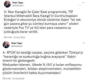 İlker Karagöz İle Çalar Saat programında, TİP İstanbul Milletvekili Sera Kadıgil’in Cumhurbaşkanı Erdoğan’ın ekonomiye dönük sözlerine ilişkin ‘bir tek gün pazara gitse şu cümleyi kurmaya utanır’ sözleri nedeniyle Fox TV’ye yüzde 3 idari para cezasına oy çokluğuyla karar verildi.