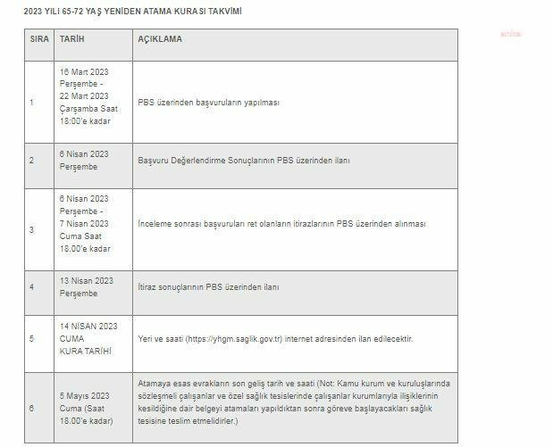 “Adayların 657 sayılı Devlet Memurları Kanunu’nun 48 inci maddesinde belirtilen genel şartları taşımaları gerekmektedir. Kura tarihi itibariyle 65 yaşını doldurmuş ve 72 yaşından gün almamış olup daha önce Sağlık Bakanlığı veya bağlı kuruluşlarında çalışmış olan tabip ve uzman tabipler, (65 yaşını doldurmayan hekimler ilan edilen diğer açıktan atama kuralarına başvuru yapabilmektedirler. 65 yaşını doldurmuş olması nedeniyle resen emekli edilerek sözleşmeli aile hekimi olarak görevine devam eden tabip ve uzman tabipler bu kuraya başvurabileceklerdir.”