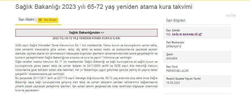 Sağlık Bakanlığı, 65-72 yaş arasındaki hekimleri atamak için ilana çıktı. İlana göre, 65-72 yaş arasında olup daha önce Sağlık Bakanlığı veya bağlı kuruluşlarında çalışmış olan tabip ve uzman tabiplerin yeniden istihdamının sağlanmasına yönelik olarak yapılacak yerleştirme işlemleri, ilan edilen takvim çerçevesinde noter tarafından bilgisayar ortamında kura ile yapılacak. Atamaya katılmak isteyenler 23 Mart saat 18.00’e kadar başvurabilecek.